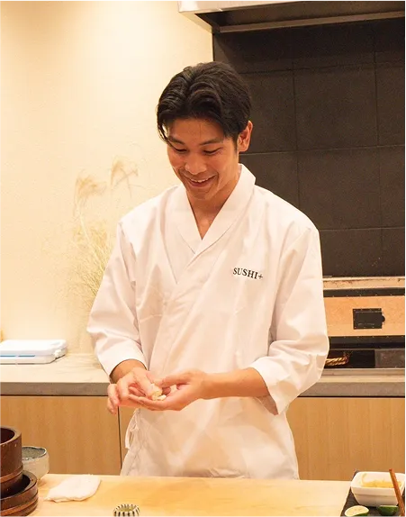 1992年東京生まれ。 ​法政大学時代、セブ島留学、ガーナへのホームステイ、ITスタートアップでのインターンなどを経験し、「本当に良いものを多くの人に知ってもらいたい」という思いを持ち、鮨職人を目指すことを決意。同大学卒業後、東京寿司アカデミーへ進学し、鮨職人に必要な技術を体系的に習得。卒業後は、六本木の名店に籍を置きつつ、鮨のフリーランスとして活動。​法人のイベントでの出張、個人宅への出張、外国人旅行者向けの鮨握り体験(200人以上の実績)などを実施。​法人向けの出張サービスは90%以上のリピート実績を誇る。2019年、「SUSHI+」を立ち上げる。